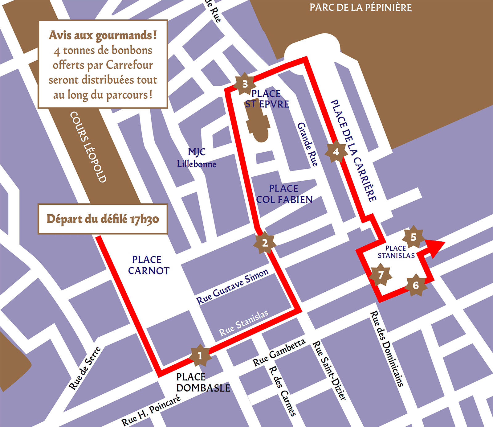 Des animations en journée et cinq compagnies mettront l’ambiance le long du parcours pour vous faire patienter avant l’arrivée du corso. Pendant ce temps Place Stanislas, La Fanfare des Enfants du Boucher servira son concert juste à point, avec même cette année des morceaux chantés… Puis le DJ Double-Dose prendra le relais avec un set survolté. Faites place !